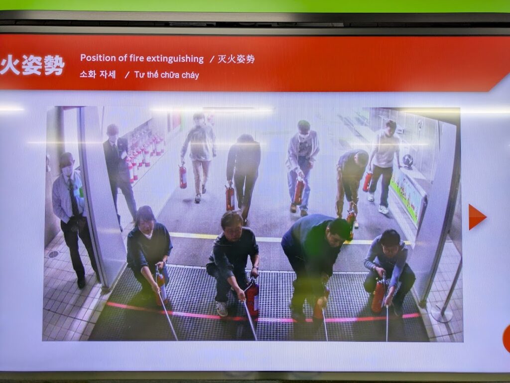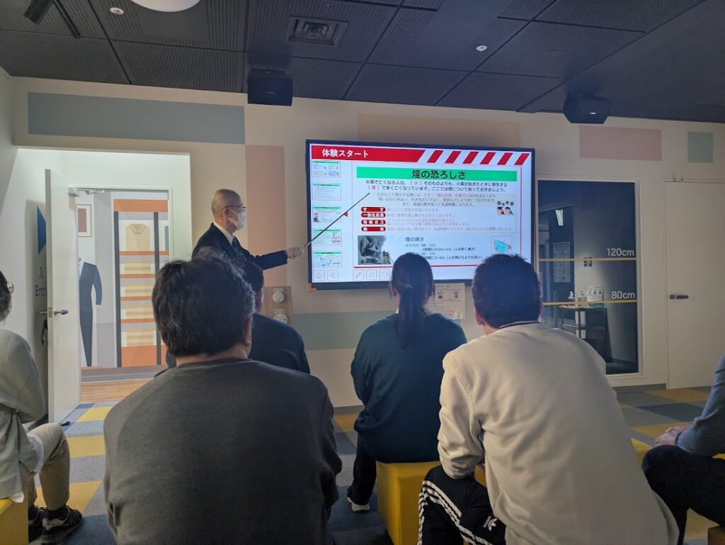 消火訓練室では火災の原因についての学習や火災現場をイメージした映像に向けて消火器を使う体験をしました。コンセントにたまったホコリに電気が通ることで発火する事例を知ったので定期的にチェックするようにしたいです。