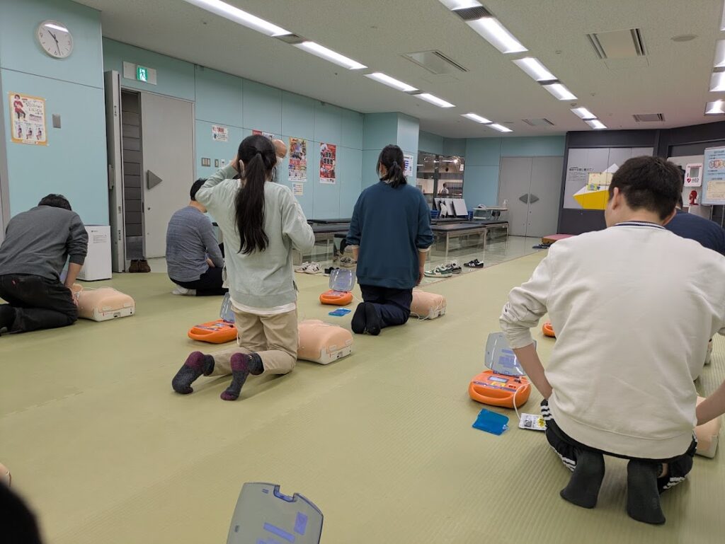 今回の講習では防災館の職員の方が同行し、様々な施設の案内をして頂きました。応急救護訓練施設では訓練用の人形を使用し、胸骨圧迫やAEDの使い方について学びました。AEDは見かけることは多くても実際に使うことはありませんでしたが音声やモニターによる指示がされる機能があることを知って驚きました。