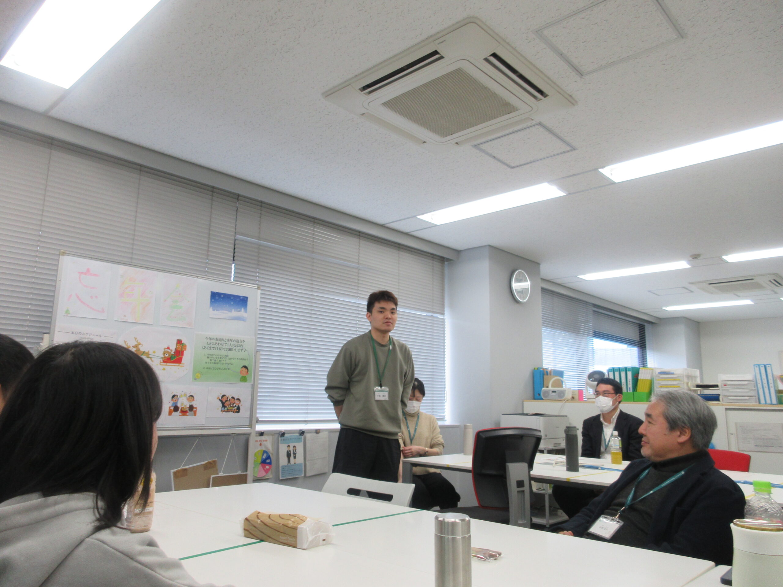私自身は、いつもは使用しないお部屋や面談などをしているスペースを重点的に掃除し、又大きい窓を2人で拭きましたが普段掃除をしていない為、汚れがすごく掃除のやりがいがありました。大掃除が終わった後は、忘年会の準備を皆さんで行い、お昼ご飯の時間から&ジョブで準備して頂いたお弁当を3種類のうちから一人一種類選び、食べました。